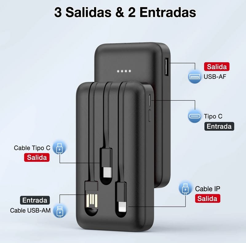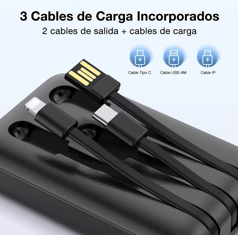 • Este Power Bank está equipado con cable IP y cable Tipo-C para resolver problemas de búsqueda y almacenamiento.